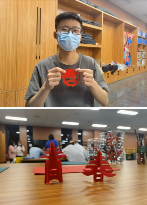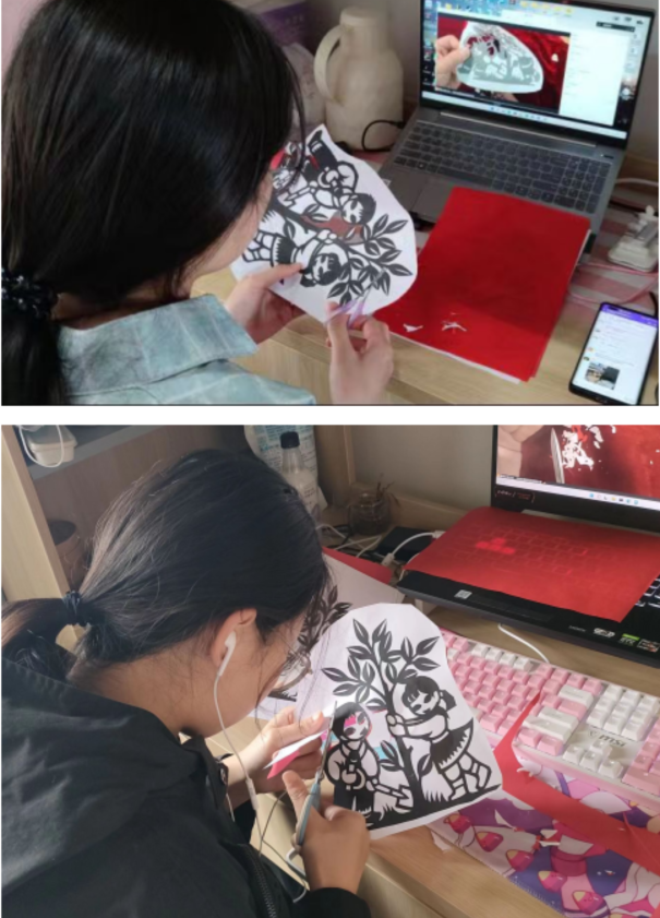 张钧老师通过视频连线传播剪纸文化,教授剪纸技巧,学生在教育基地体验剪纸,剪纸主题讴歌抗疫精神,颂扬百年党史,弘扬青春之歌。除现场体验外,云端的近两百名同学在宿舍里亲身体验了剪纸的过程。活动结束后,同学们上传了活动图片,纷纷表示,剪纸看着简单,但它需要手和脑的高度配合,特别考验一个人的观察力和注意力。不但如此,它还能起到调整呼吸、放松身心的作用,对于疫情期间的同学们而言,既有趣味,又有益处。方寸之间,还寄托了大学生们对美的追求和对未来的向往。