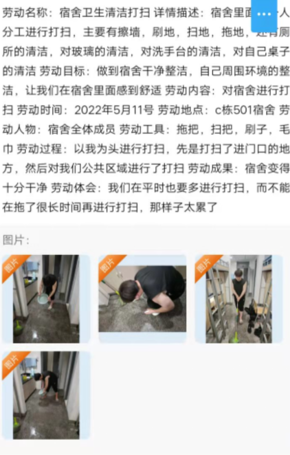 线下活动主要开展日常生活劳动,即清洁宿舍卫生、整理个人物品等。大学生宿舍是其学习生活的主要场所,一个干净整洁的宿舍令人赏心悦目,体现的是全体宿舍人员的良好卫生意识、积极的团队合作精神,以及融洽的集体生活氛围。在老师的指导下,所有学生对自己宿舍的卫生进行了认真清扫,在劳动过程中出出汗、动动手,体认劳动的不容易,从而培养学生不怕累、不怕苦的劳动品质。
