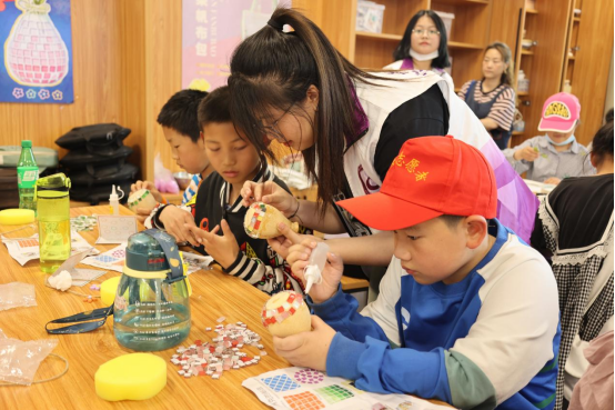 此次活动主要分为手工手绘、感恩舞蹈、趣味象棋、剪花体验4个部分。活动伊始,“小城志”们带领小朋友们进行拓染帆布包、拼豆和马赛克花瓶的制作,充分发挥小朋友们的动手能力和创造能力。