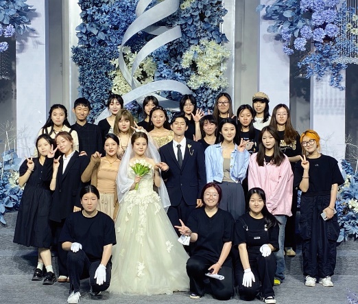 2021级婚庆班同学在本学期学习专业课程《婚礼策划》伊始就把自己当成一名未来的婚礼策划师,对照婚礼策划岗位工作流程标准,从校外兼职教师提供的真实婚礼策划案例中选取一个作为背景信息,去收集新人爱情故事,寻找创意思路,提取设计元素,设计婚礼主题,收集和选取婚礼宴会背景,设计仪式流程,并制成PPT在课堂中模拟婚礼提案,然后去喜悦山婚礼堂现场彩排,最后根据婚礼堂空间布景设计来调整策划方案,直至此次主题婚礼秀的成功演出。主题婚礼秀活动检验了学生的专业综合技能,提高了他们的专业自信心,也让他们在今年7月能更加从容自信走上顶岗实习岗位。
