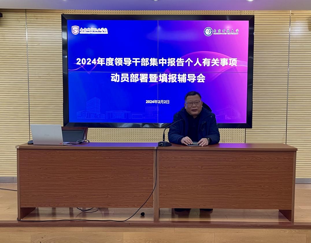 根据市委组织部对领导干部报告个人有关事项工作的部署要求,为高质量做好集中填报工作,2月2日上午,学校在新街口校区十楼报告厅召开2024年领导干部集中报告个人有关事项动员部署暨填报辅导会,校党委书记孙朝晖作动员部署讲话,校领导、中层干部参加会议。