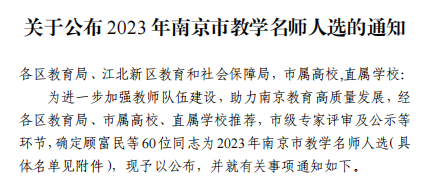南京市教学名师评选是深入贯彻落实《中共中央国务院关于全面深化新时代教师队伍建设改革的意见》及省委省政府、市委市政府关于深化新时代教师队伍建设改革的实施意见,促进全市教师教育教学水平的提升,助力南京教育高质量发展所开展的表彰工作。