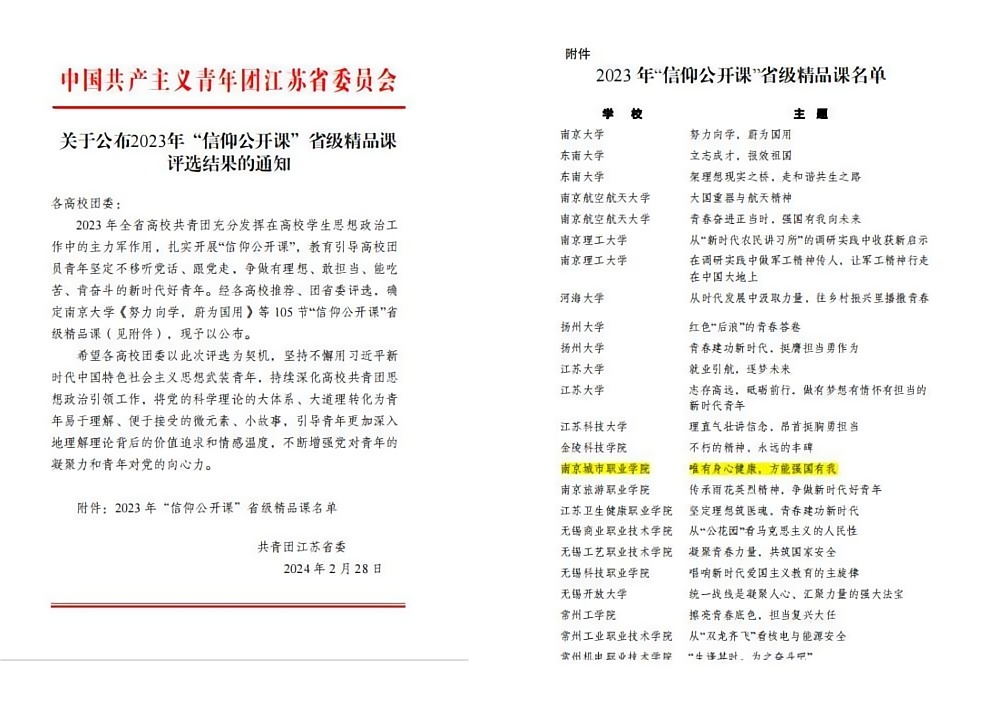 近日,共青团江苏省委公布2023年“信仰公开课”省级精品示范课评选结果,我校报送的《唯有身心健康,方能强国有我》获评省级精品示范课。
