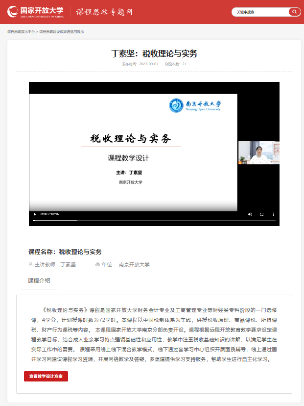 近日,国家开放大学公布了2024年课程思政建设成果遴选名单,我校教师丁素坚的《税收理论与实务》课程思政建设成果于众多申报材料中脱颖而出,在“国家开放大学课程思政专题网”国家开放大学-课程思政展示平台 (ouchn.cn)上进行了宣传展示,供体系内教师学习和交流。