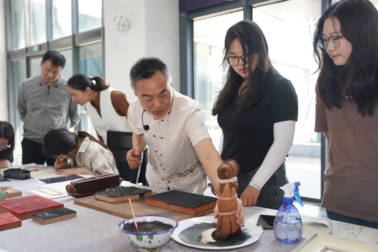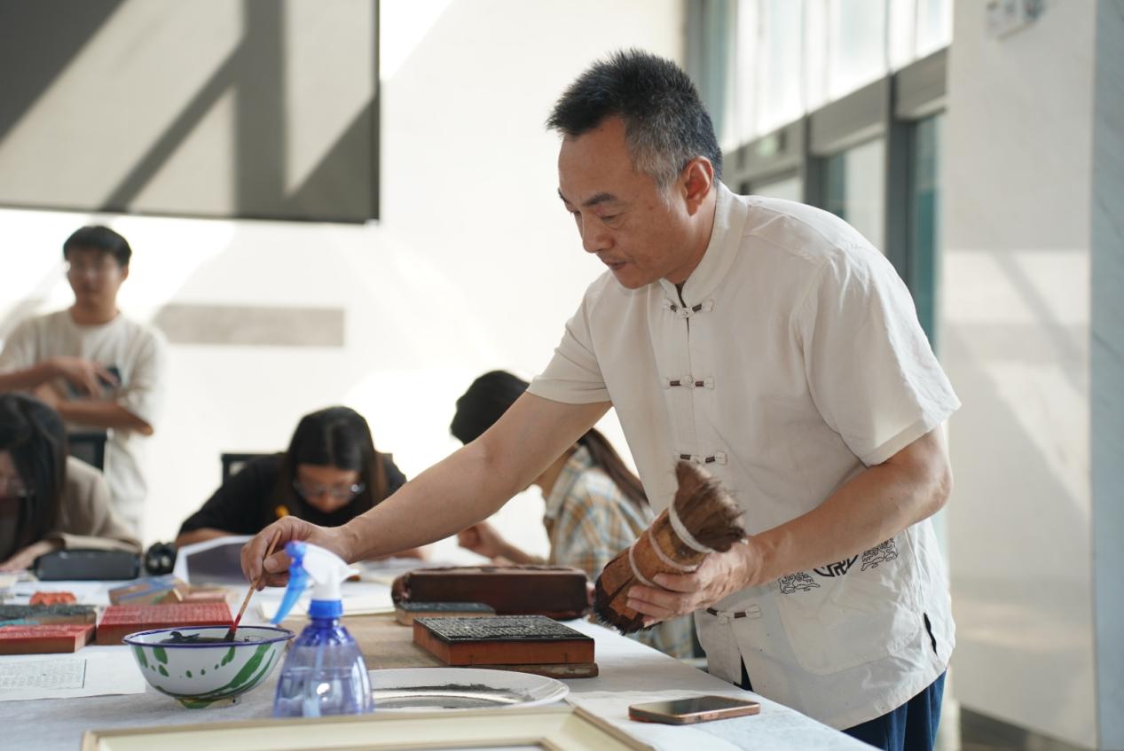 活动伊始,师生们首先聚焦于一项古老而珍贵的技艺——大运河非物质文化遗产“雕版印刷”。依托“李江民非遗技艺传承技能大师工作室”,邀请扬州市非物质文化遗产雕版印刷技艺代表性传承人李华俊老师现场讲解示范。以艺术类专业课程和非遗社团活动为主要载体,向师生宣传并传授非遗技艺,深入探索非遗资源有机融入文化生活、深度嵌入文化产业发展的活态化传承手段。活动现场,李老师指导师生操作体验木版雕刻工具,细心雕刻精美图案和文字,亲手印刷在宣纸上,体验了从雕刻到印刷的完整流程。这一过程中,师生们深入了解了雕版印刷的历史背景、技艺特点以及文化传承重要意义。通过体验雕刻和印刷,大家深刻体会到传统技艺的魅力和价值,仿佛与古人进行了一次跨越时空的对话。沉浸式体验不仅引导师生感受到传统文化的厚重,也进一步激发了他们对传统文化的热爱和传承意识。