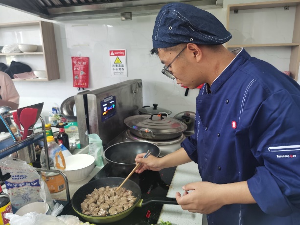活动伊始,各组根据主题要求布置展台,展示营养食谱、食品标签。然后各组按照设计好的菜单进行营养餐制作,或蒸或煮,或炒或炖,荤素搭配,五色俱全。评委老师巡视观察各小组成员的动作技能、食材搭配、卫生安全等。