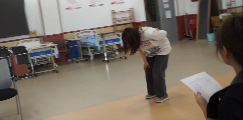该项比赛中设置了一位老年人身高、体重、年龄、喜好和生平经历等基本情境,提供了5种老年人常见病发作的场景,如心绞痛、低血糖、关节炎等,要求参赛学生能够准确模拟该设定下的疾病疼痛反应和情绪、行为变化。比赛中,选手按照她设计的老年人散步场景表现出膝关节炎的疾病表现和自救措施:膝盖胀痛导致无法走路,神情痛苦,手指微微颤抖,但坚持通过揉搓使膝盖部位痛感降低。