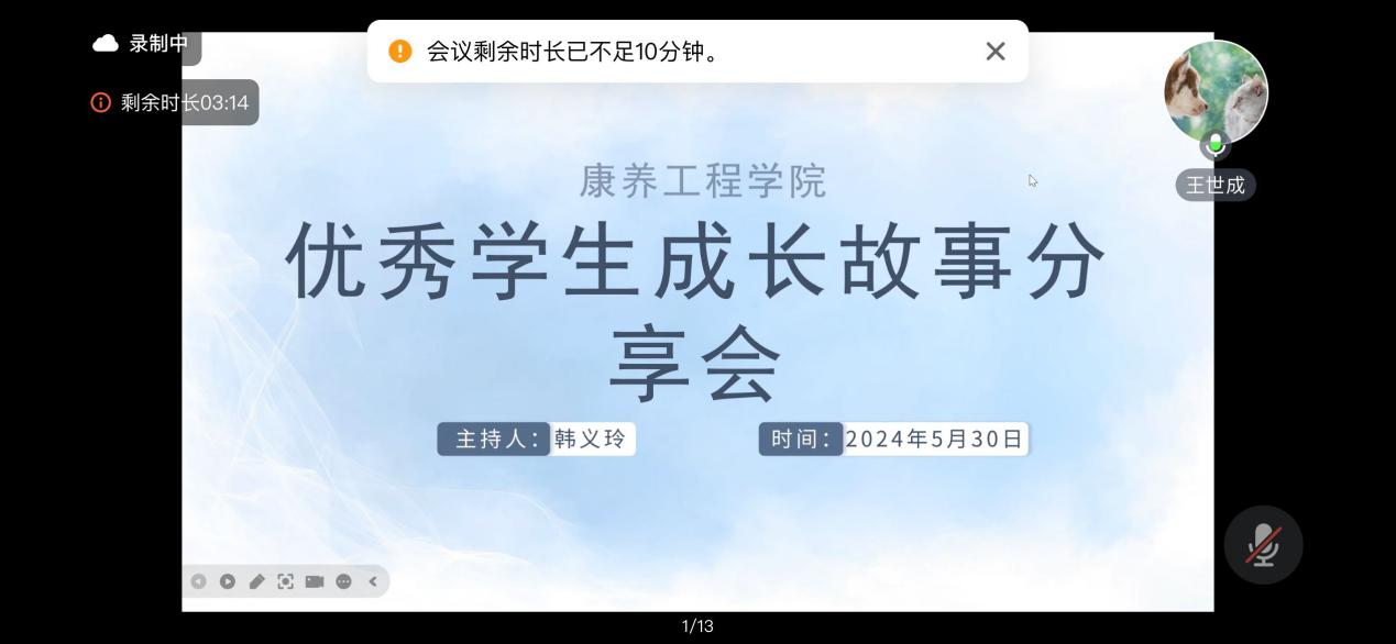 为了更好地发挥优秀学生的示范带动作用,激劢更多同学奋发向前,追求卓越,康养工作学院组织职教周优秀学生成长故事分享会。本次活动邀请了优秀毕业生代表2020级旅游管理班宋佳怡、2020级老年服务与管理1班盈菲、2018级建筑工程技术1班王世成分享他们的成长经历。530日晚7点分享会如期而至,近百名同学通过腾讯会议参加此次活动。