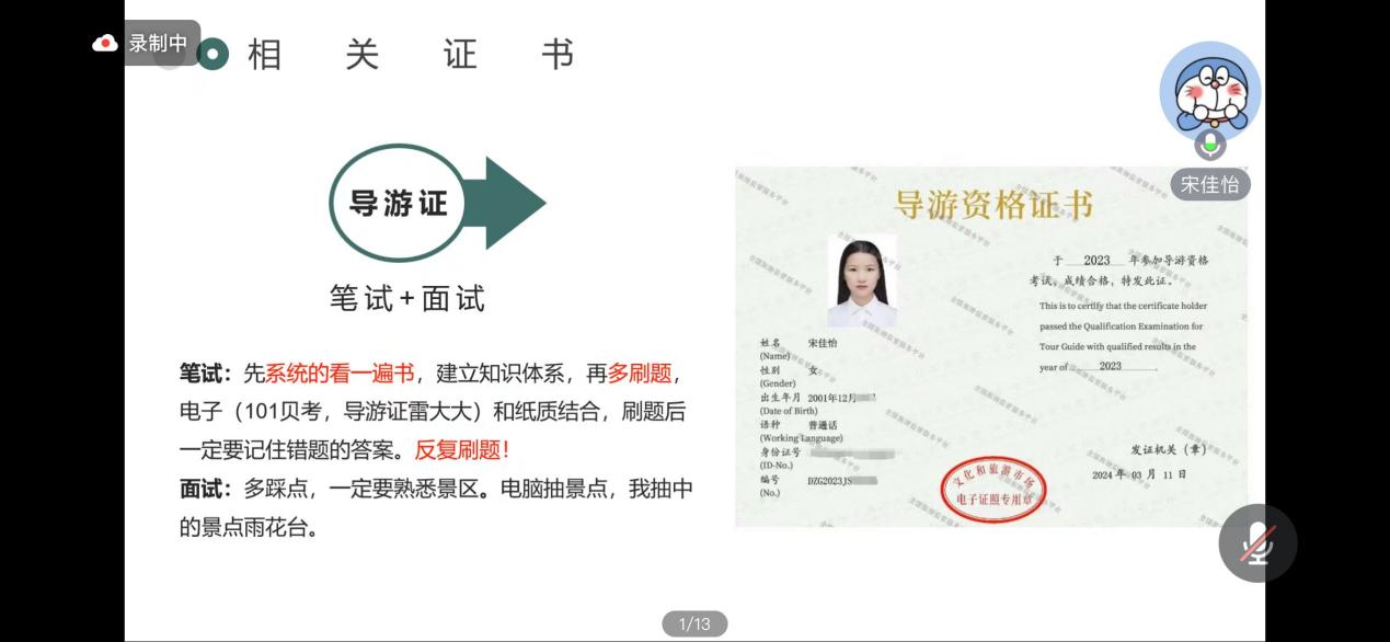 星光不问赶路人,时光不负实干者。”宋佳怡分享了考导游证的一些经验,笔试时,大家需要系统地阅读教材,建立知识体系,多刷题。面试时,老师会问一些问题,如景点、国际歌、国共合作等,并分享了在英语学习方面的心得。