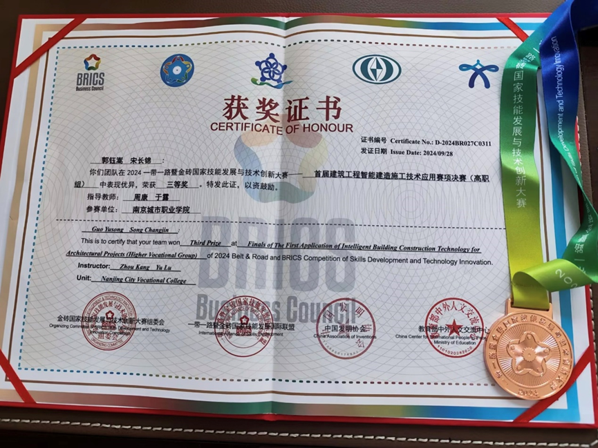 9月26至28日,2024一带一路暨金砖国家技能发展与技术创新大赛首届建筑工程智能建造施工技术应用竞赛决赛,在浙江建设职业技术学院举行。我校康养工程学院2022级建筑工程技术专业学生宋长锦、郭钰嵩在高职组比赛中荣获三等奖。
