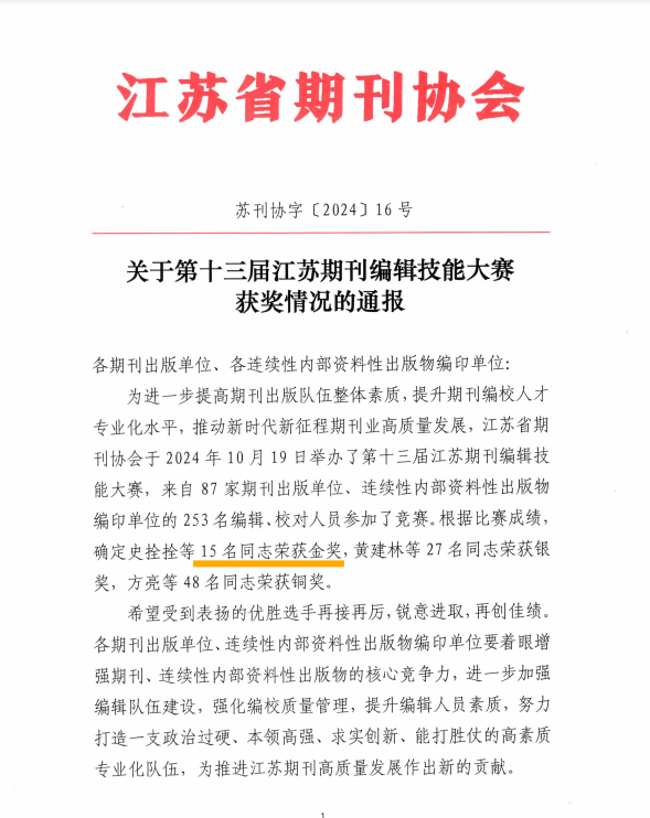 全省期刊编辑技能大赛是江苏省期刊协会为进一步提高期刊出版队伍整体素质、提升期刊编校人才专业化水平、推动新时代新征程期刊业高质量发展而举办的年度赛事。20241019日在南京举办的第十三届江苏期刊编辑技能大赛,共有来自87家期刊出版单位、连续性内部资料性出版物编印单位的253名编辑、校对人员参加竞赛,评出金奖15名、银奖27名、铜奖48名。我校学报编辑部薛健老师凭借出色的业务水平与专业素养,获得本次大赛金奖,在253名参赛选手中排名第6位。