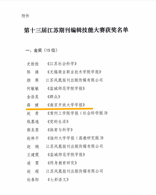 近日,江苏省期刊协会公布了第十三届江苏期刊编辑技能大赛获奖情况,我校学报编辑薛健老师喜获金奖。