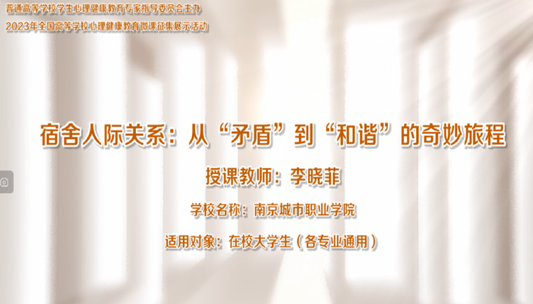 今年1月份,普通高等学校学生心理健康教育专家指导委员会组织开展了全国高等学校心理健康教育微课征集展示活动。4月底,公共教学部上报综合素养教研室李晓菲老师微课作品《宿舍人际关系:从“矛盾”到“和谐”的奇妙旅程》参加征集。