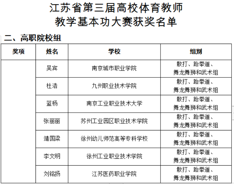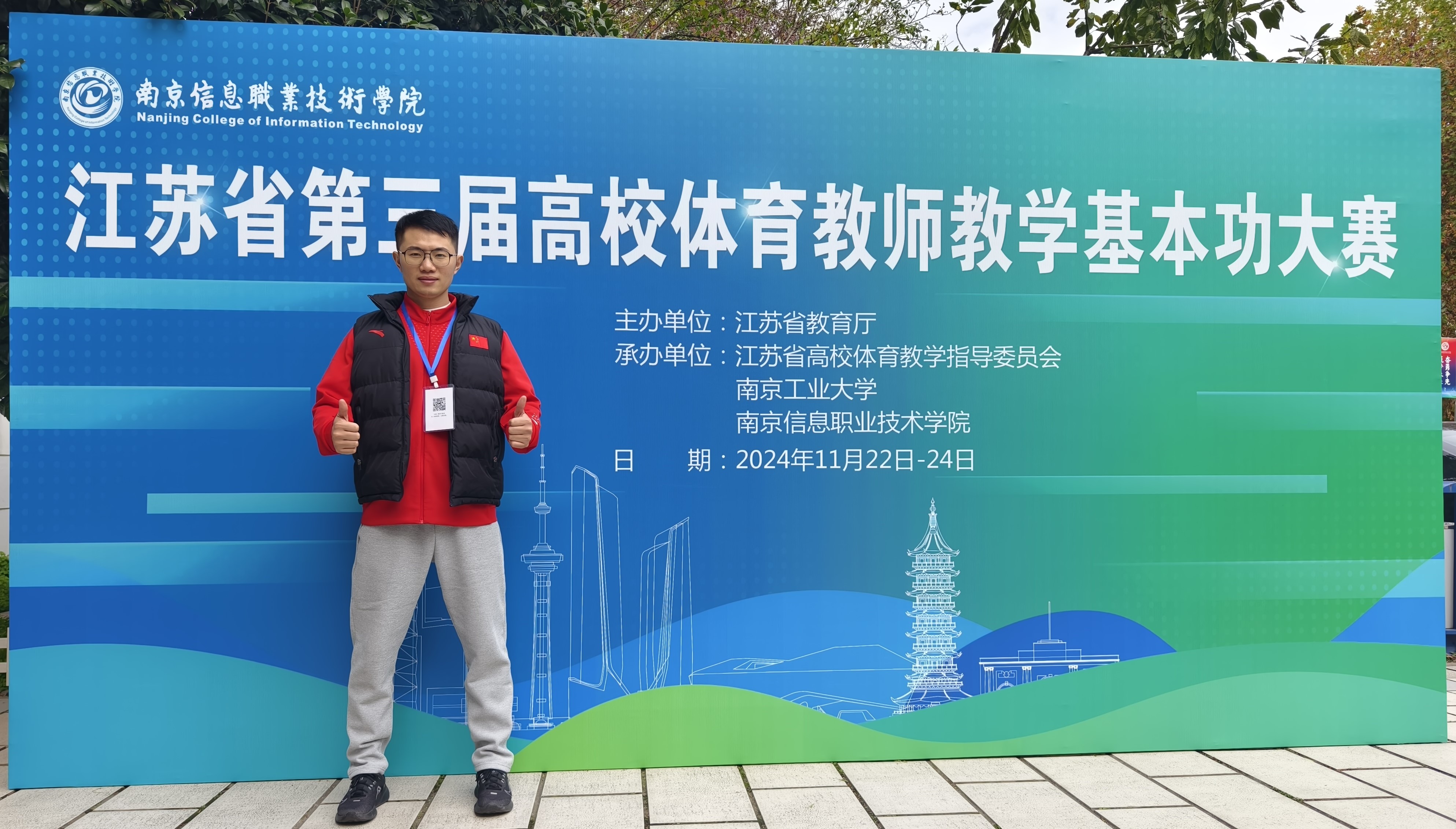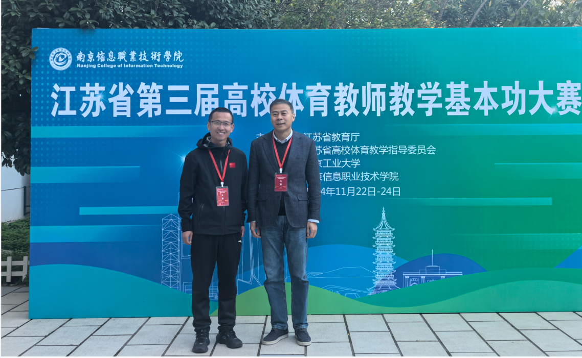 20241121日至1124日,由省教育厅主办的江苏省第三届高校体育教师基本功大赛在南京举行。我校吴宾、李明2位教师参加高职组比赛,经激烈角逐,吴宾老师荣获三等奖。徐京朝教授被省教育厅选派担任本次大赛评审专家。