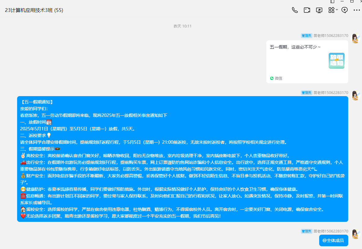 五一假期临近,为增强学生安全意识,营造平安和谐的校园环境,智能工程学院辅导员团队多措并举,通过走访宿舍、召开主题班会、QQ信息提醒等形式,全方位开展节前安全教育活动,为学生假期安全“保驾护航”。