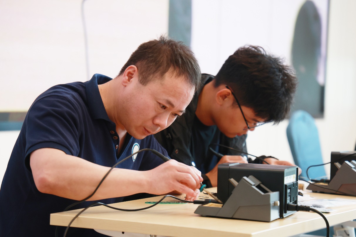 宣讲环节的技术分享,点燃了同学们的实践热情。在“工匠学子技艺比拼”环节,徐振乾现场出题:“模拟SMT焊接场景,完成芯片引脚焊接,要求无虚焊、无连焊。”智能工程学院3名学生主动请缨,走上舞台,与劳模同台比拼技艺。焊接结束点评时徐振乾说:“虽然还有提升空间,但这股子‘敢挑战’的劲头,就是工匠的苗子!”。随后,刘锡云针对长安订单班学生的提问:“面对智能化检测设备,你们觉得传统检测经验会被替代吗?”刘锡云表示技术会迭代,但‘精益求精’的匠心永远是核心竞争力。