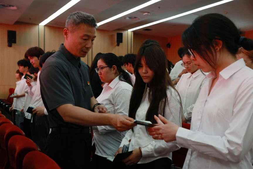 随着雄壮激昂的国歌奏响,入团仪式正式拉开帷幕。全体与会师生庄严肃立,齐声高唱国歌,现场气氛庄重而热烈。随后,主持人司玉飞向在场团员、团干部阐释入团仪式的深刻意义,并宣读新团员名单,向光荣加入共青团的青年学子致以热烈祝贺。在鲜艳团旗的映照下,老师们依次为新团员佩戴团徽、颁发团员证,一枚枚团徽佩戴在胸前,承载着责任与使命。