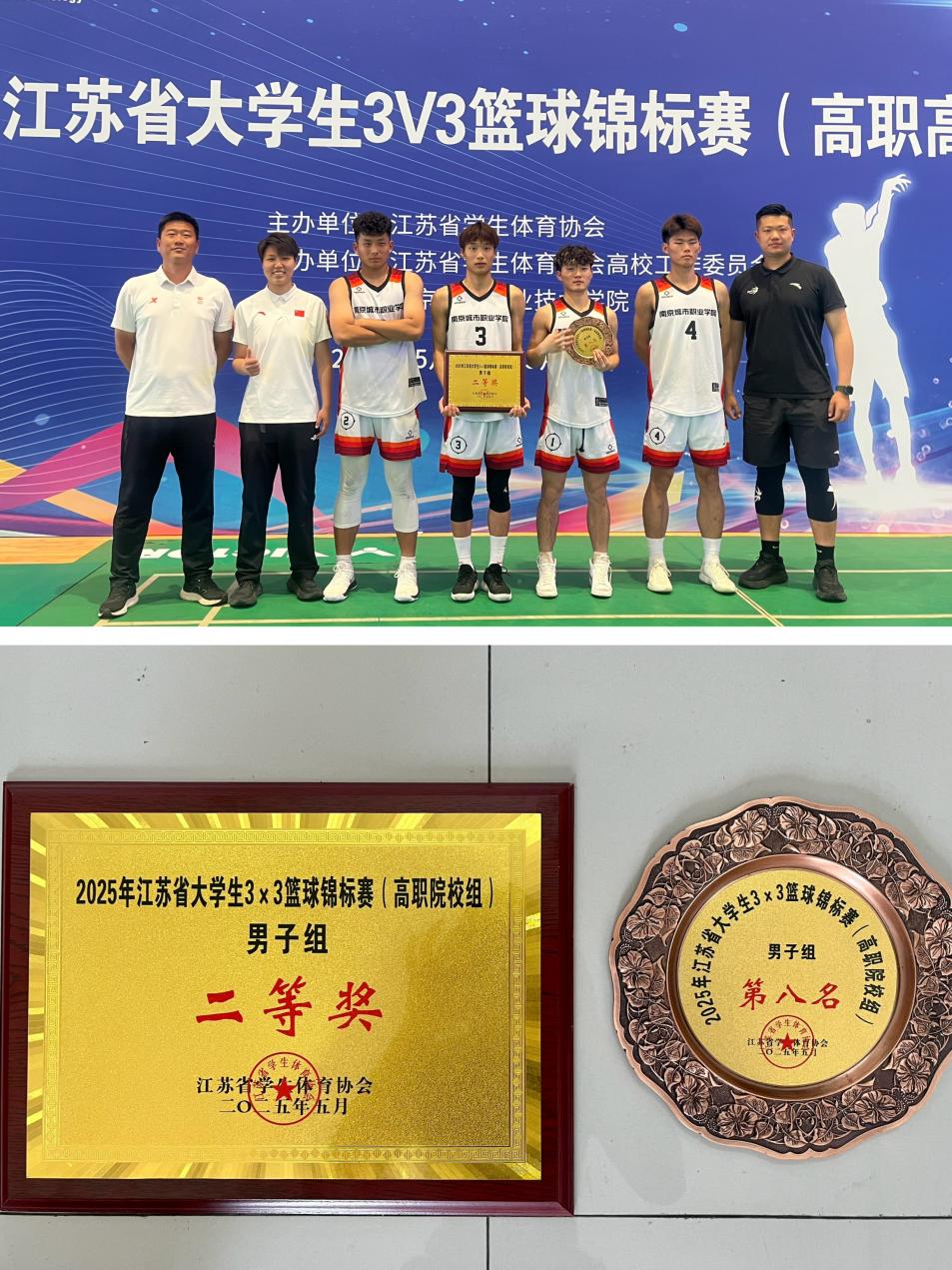 5月24日-25日,2025年江苏省大学生3V3篮球锦标赛(高职院校组)火热开赛。我校代表队由康养工程学院王俊杰、李中浩、王庆祥与智能工程学院成尹俊四位同学组建,领队杨东、教练洪家敏率队参赛。经两天鏖战,我校代表队以小组全胜战绩成功突围,最终荣获二等奖(第八名),创我校篮球项目历史最好成绩。