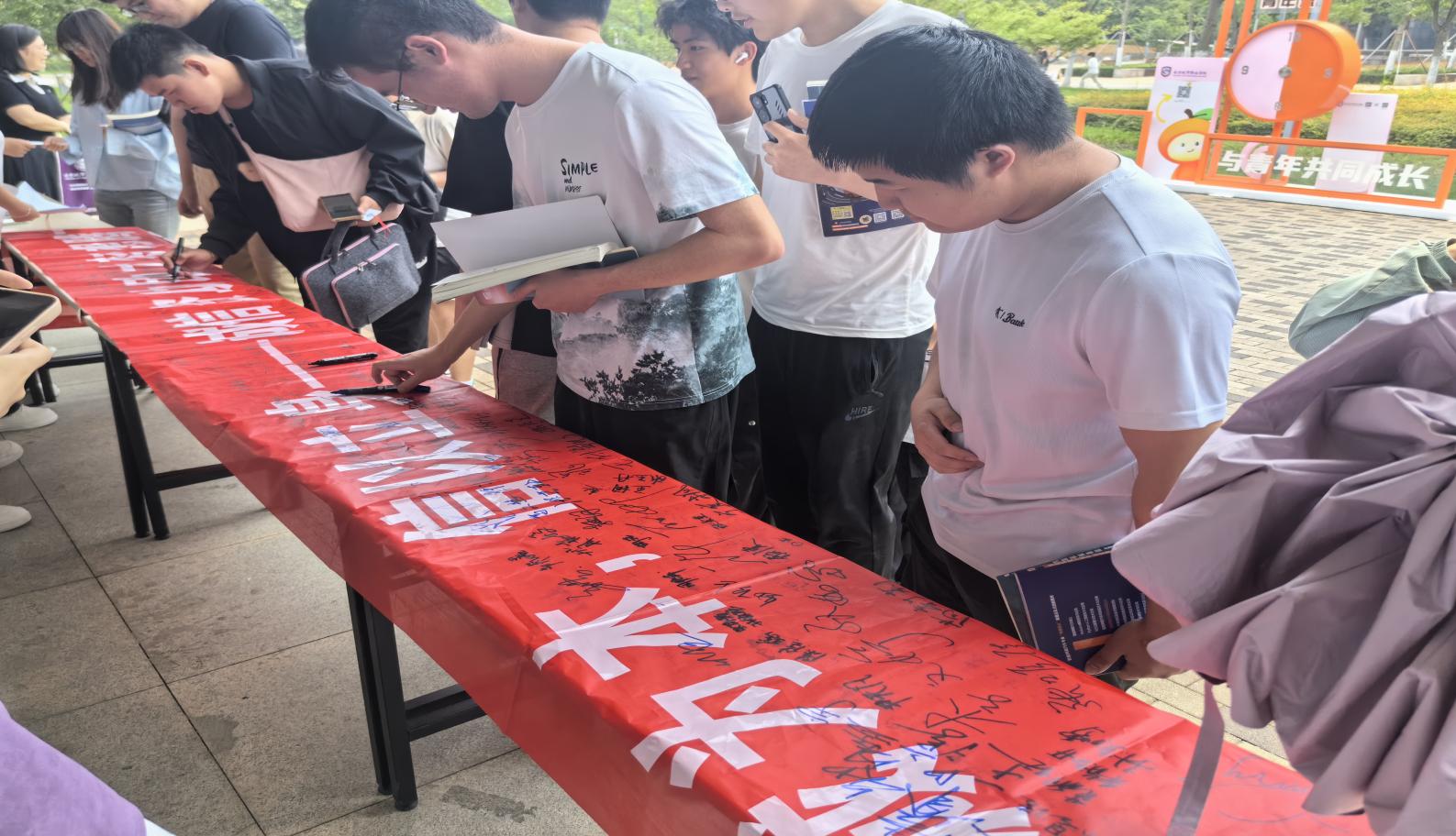 签名活动中,每位师生都显得格外郑重,他们用浓墨重彩的笔触,在横幅上留下深刻印记。这代表着一份坚定的承诺,也是对个人责任的一种自觉担当。现场还设置了答题环节。工作人员准备了100与国家资助政策、诚信知识相关的问题,同学们积极参与答题,现场气氛十分活跃。对于答出问题的同学,工作人员会奖励一枚精美的文创书签,既具有纪念意义,又能时刻提醒同学们要坚守诚信。