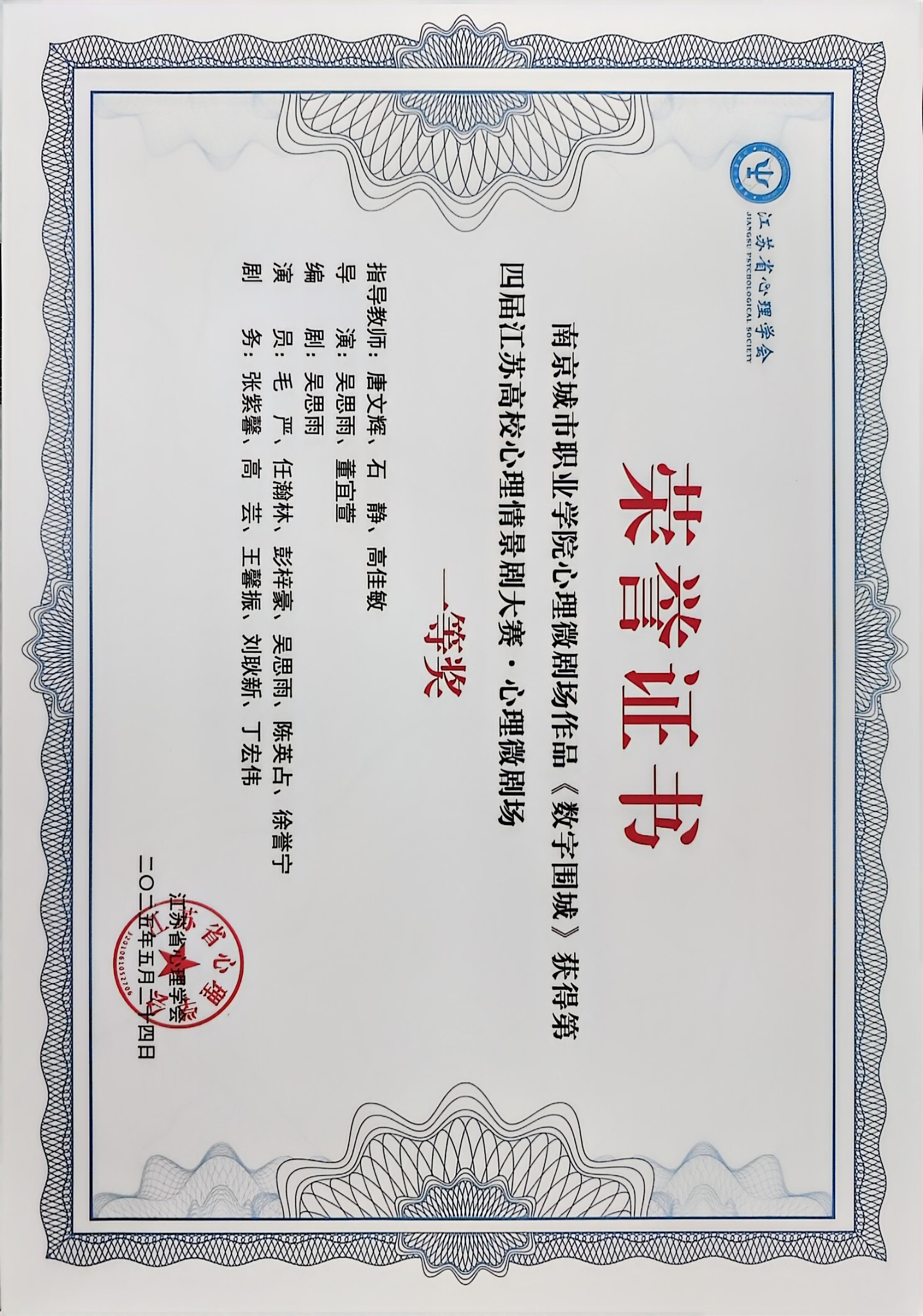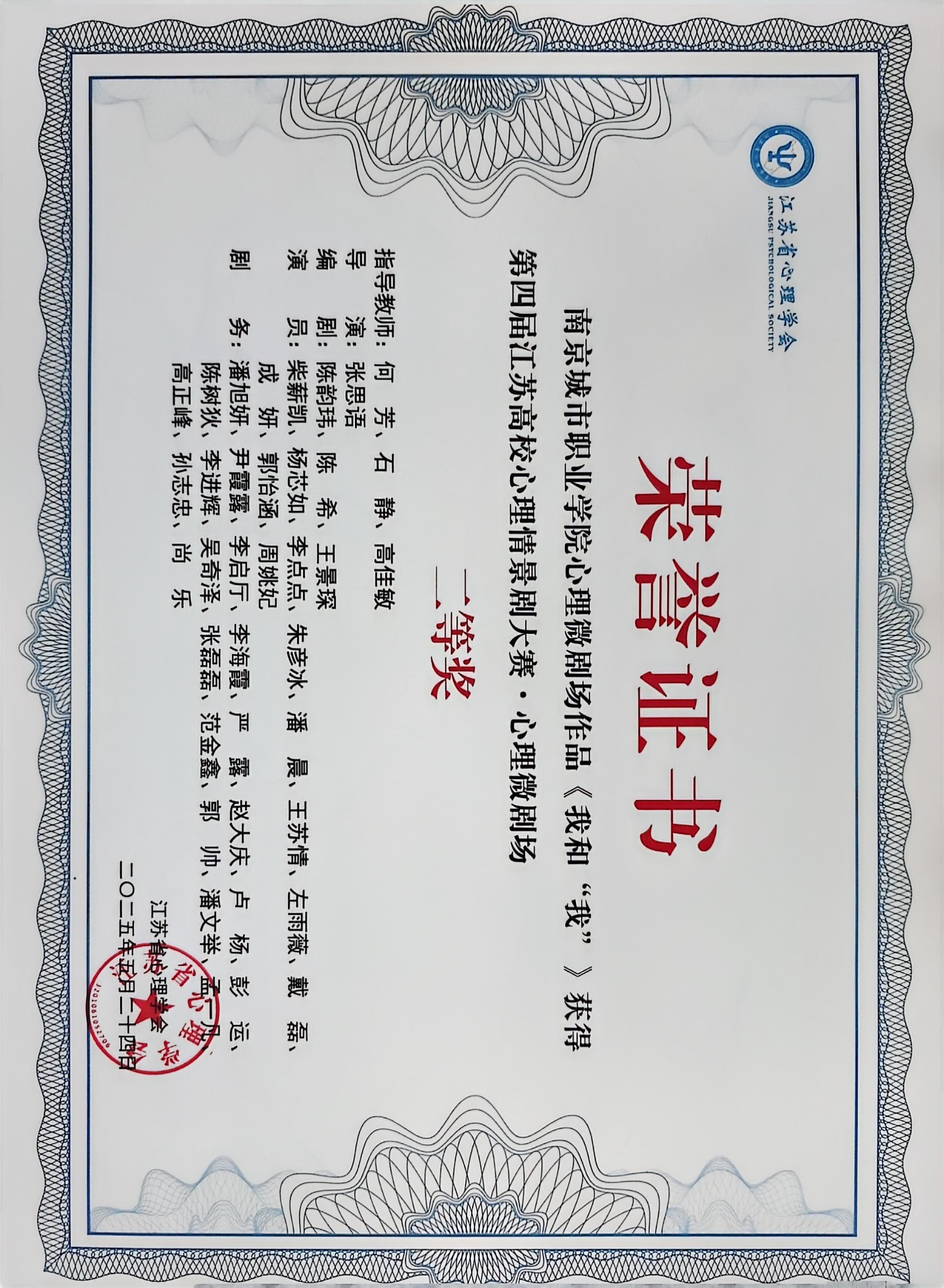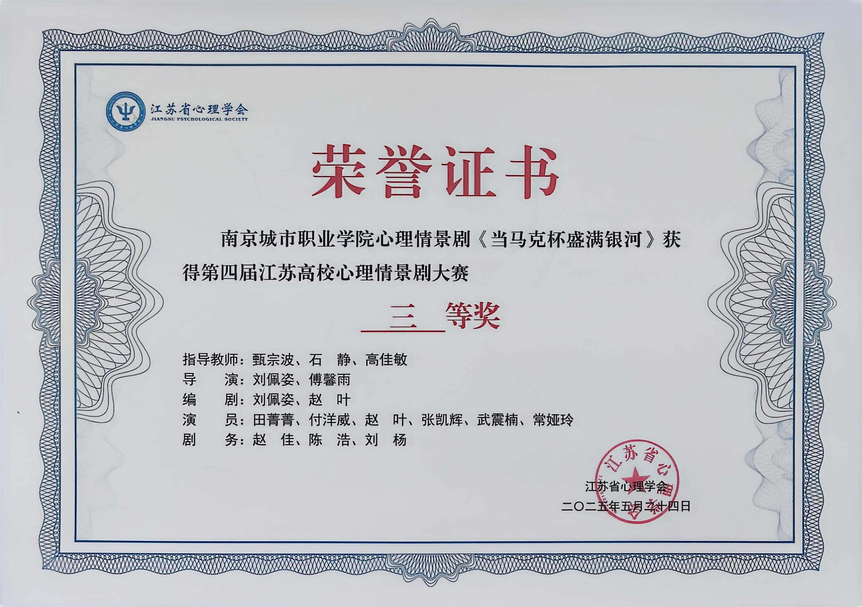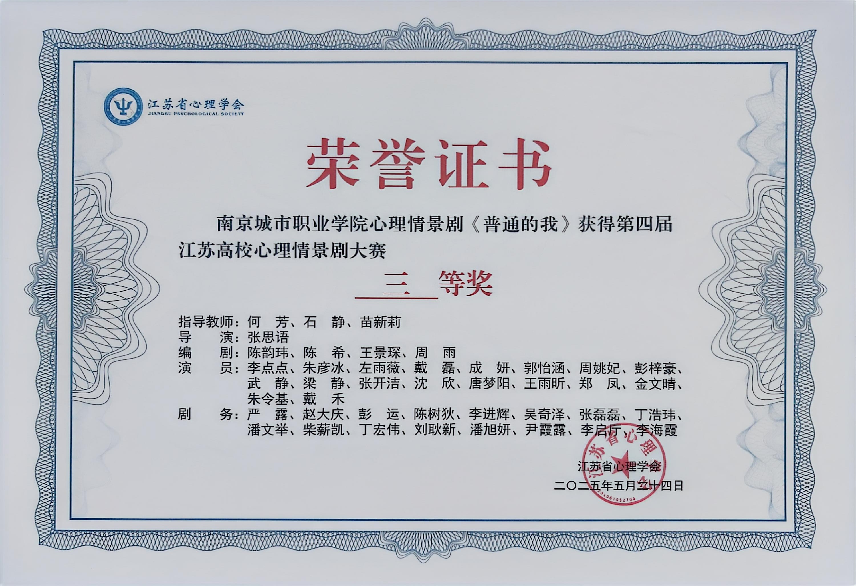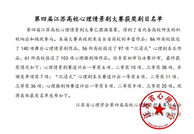 在江苏省心理学会主办的第四届江苏高校心理情景剧大赛中,我校再创佳绩!满额选送的6项作品全部获奖。