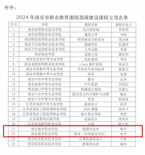 近日,南京市职教(成人)教研室公布2024年南京市职业教育课程思政建设课程名单,我校《数据库技术》与《体育(传统健身功法)》两门课程凭借扎实的课程建设基础、创新的教学理念以及显著的思政育人成效成功入选。