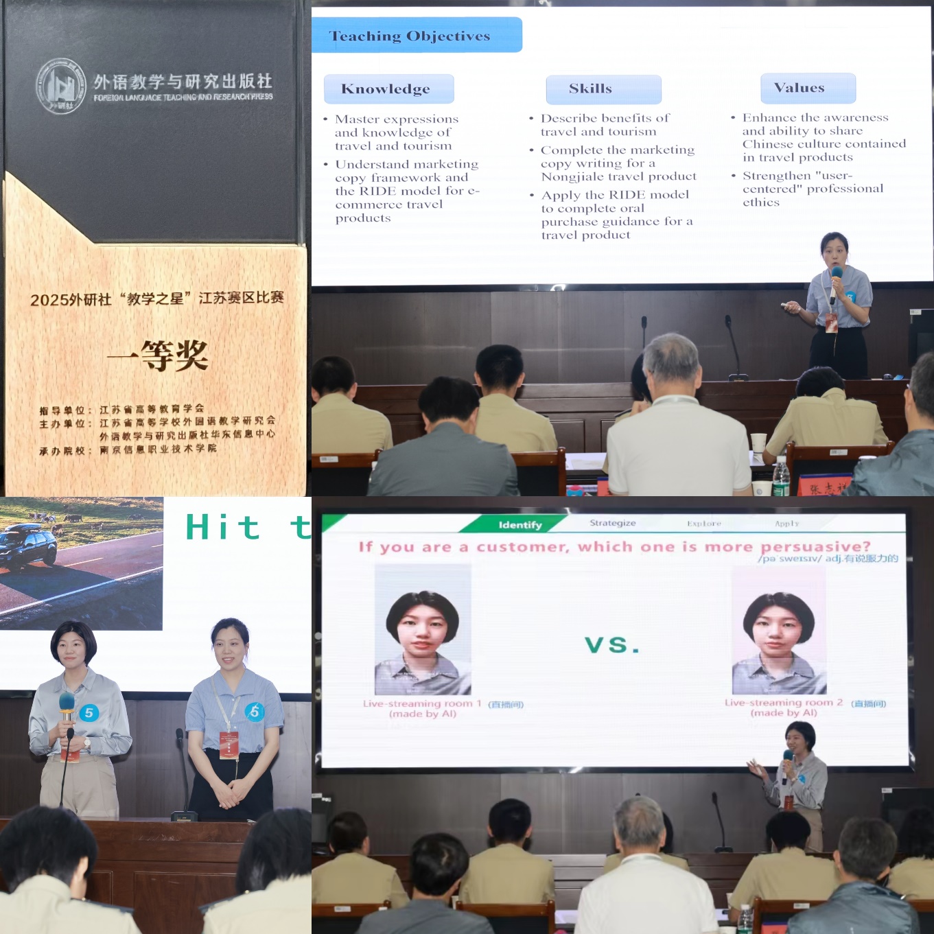 621日至22日,2025外研社全国高校外语教师“教学之星”大赛江苏赛区比赛在南京信息职业技术学院举行。我校公共教学部潘敏、支婷婷、赵羽涵、沈玲教师团队代表我校首次参赛,荣获高职组一等奖(最高等次奖项)第二名,成功晋级全国半决赛。