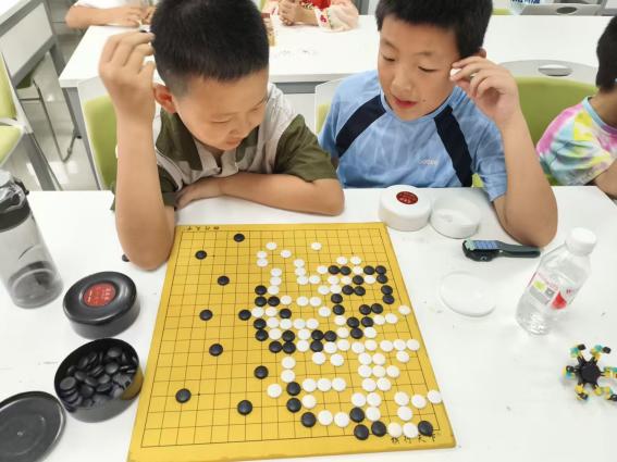 课堂上,志愿者以“棋盘上的历史故事”为引,用动画短片讲述围棋“尧造围棋教丹朱”的传说与象棋“楚河汉界”的由来,将围棋黑白子比作“天地阴阳”、象棋“车马炮”喻为“古代军阵”,让抽象文化概念变得生动易懂。在基础规则教学中,志愿者分组演示围棋“围空”与象棋“走子”技巧,用彩色磁贴讲解“气”的概念,以卡通棋子卡片辅助记忆“马走日、象走田”口诀。小朋友两两对弈时,孩子们或蹙眉思考战术,或研究对手棋路,志愿者适时提醒“下棋想三步”“围棋占角生根”,并通过“棋语小卡片”引导学习“先手”“收官”等术语。