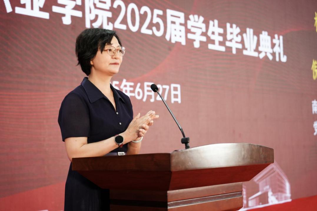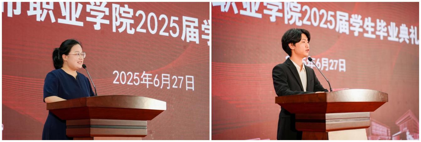 党委副书记、校长倪杰代表学校向毕业生致以热烈祝贺,向教职工表示诚挚谢意,并向毕业生提出三点期望:一是坚守使命担当,勇挑社会责任。她以“养老托育的人性微光、财经电商的市井烟火、艺术文创的文化坚守、新兴工科的大国担当”等具象比喻,阐释不同职业的责任价值,强调“个人理想需扎根祖国土壤”,号召毕业生在技能报国的征程中实现人生价值;二是永葆学习热情,奋斗砥砺前行。针对人工智能时代知识迭代挑战,她指出“毕业是终身学习新起点”,鼓励毕业生以创新思维突破舒适区,在技术变革中勇立潮头;三是保持奋进心态,绽放青春光芒。面对社会竞争压力,她寄语毕业生向“躺平”说不、向“奋进”而行,在风雨兼程中劈波斩棘,在青春赛道上跑出精彩人生答卷。