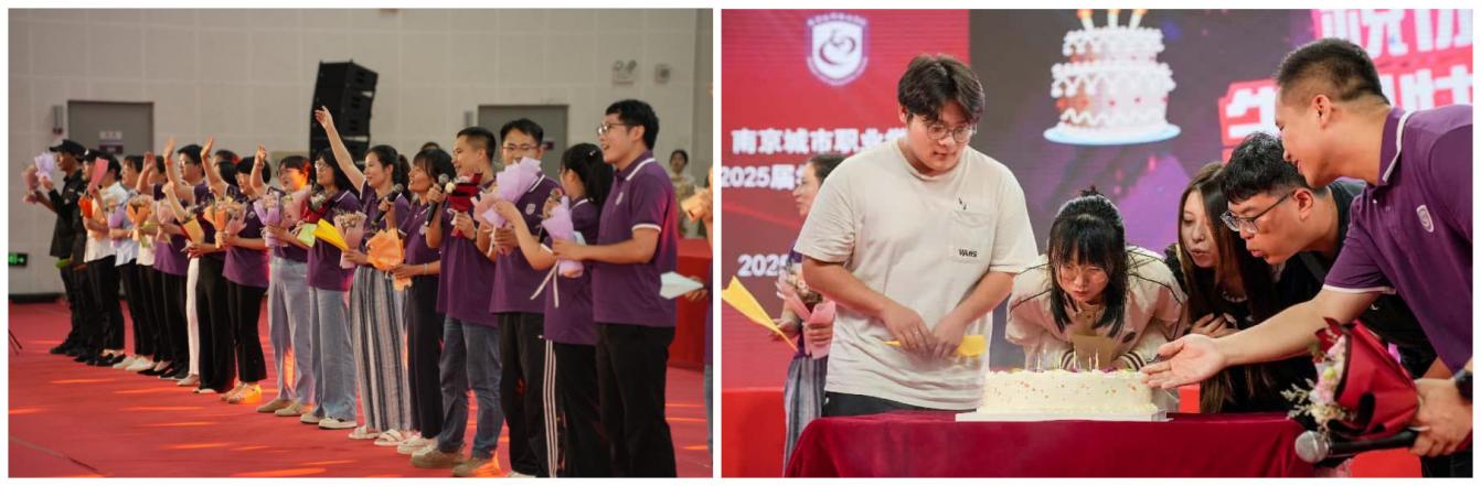 《离别开出花》的旋律缓缓流淌,毕业班辅导员、任课教师与宿管阿姨、安保师傅等后勤人员依次登台,用歌声深情诉说对毕业生的牵挂。曲毕,毕业生手捧鲜花,献给朝夕相伴的师长,以花传情,致谢岁月中的温暖守护。学校为典礼当日过生日的毕业生献上生日蛋糕,师生共同吹灭蜡烛,在温馨祝福中愿全体2025届毕业生人生如烛光般温暖明亮,如蛋糕般甜蜜圆满,将现场氛围推向温情高潮。