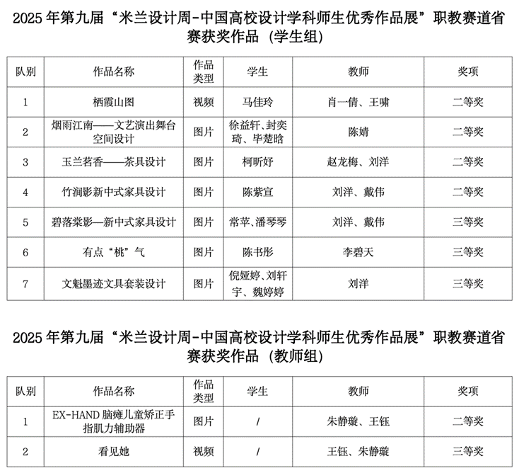 近日,2025年第九届“米兰设计周-中国高校设计学科师生优秀作品展”职教赛道江苏省赛结果揭晓。我校数字文创学院精心筹备,经教师专业指导、学院严格审核选送的32件作品在激烈竞争中脱颖而出。最终,7 名学生与 2 名教师的作品大放异彩,一举斩获职教赛道省赛二等奖 5 项、三等奖 4 项。 5 件二等奖作品成功晋级国赛,向更高荣誉发起冲击。