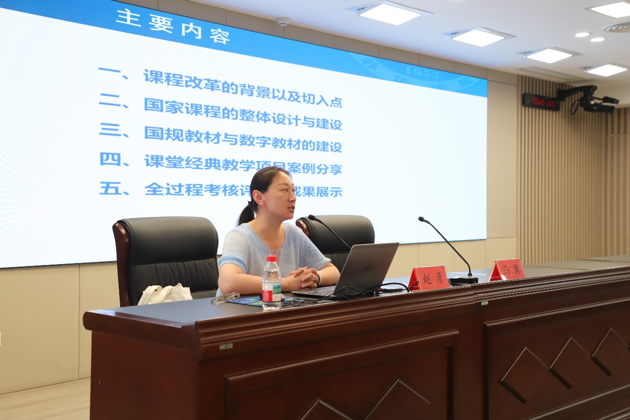 710日下午,江苏信息职业技术学院赵彦教授开展“教育数字化背景下职业院校课程与教材建设及实践”讲座。她从课程改革背景及切入点入手,强调教学改革要围绕岗位需求和学生发展精准进行。她重点阐述了如何构建科学合理的课程体系,通过具体教材案例,向教师展示了如何编写融入思政元素的规划教材与数字教材。