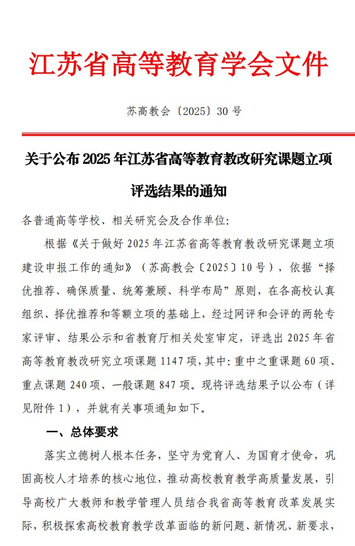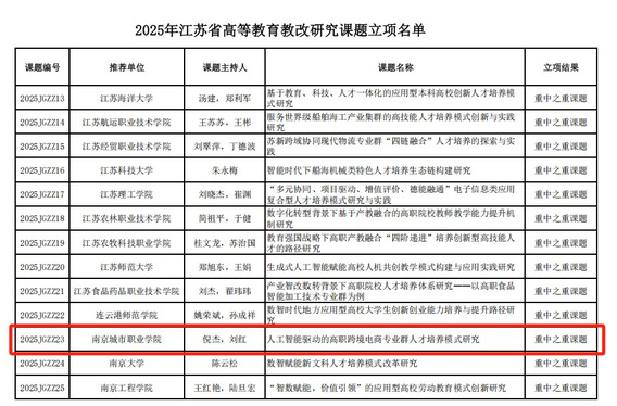 近日,江苏省高等教育学会公布了《2025年江苏省高等教育教改研究课题立项评选结果》(苏高教会〔2025〕30号)。我校党委副书记、校长倪杰教授,数字财商学院党总支书记、院长刘红教授主持的课题《人工智能驱动的高职跨境电商专业群人才培养模式研究》成功获批“重中之重”课题。这是我校首次获此殊荣,标志着我校教育教学改革工作取得历史性突破!