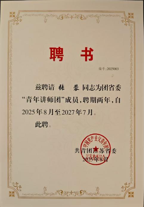 8月24日至27日,共青团江苏省委青年讲师团培训班在南京双门楼宾馆举办,我校共青团南京市委宣讲团成员、马克思主义学院教师张蓉受邀参加培训,并获聘共青团江苏省委“青年讲师团”成员。