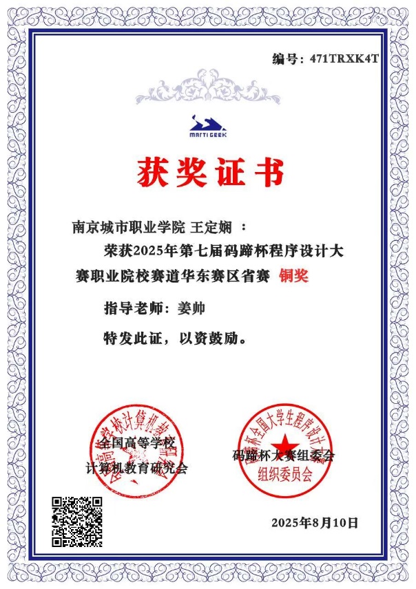 近日,由全国高等学校计算机教育研究会主办、清华大学出版社承办的2025年码蹄杯全国大学生程序设计大赛顺利举办。在智能工程学院姜帅老师指导下,智能控制技术专业李子昂、佘智慧、张瑞涵同学获得职业院校赛道(省赛)银牌,电子信息技术专业王定娴同学获得职业院校赛道(省赛)铜牌。