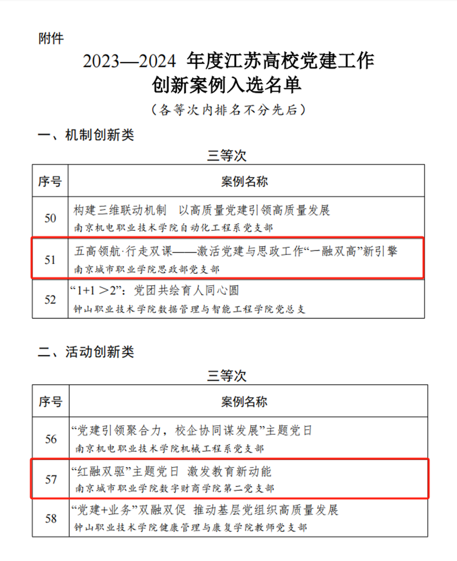 近日,省委教育工委公布2023-2024年度江苏高校党建工作创新案例名单,我校申报的两个案例全部入选。思政部党支部“五高领航·行走双课——激活党建与思政工作‘一融双高’新引擎”案例入选机制创新类第三等次;数字财商学院第二党支部“‘红融双驱’主题党日 激发教育新动能”案例入选活动创新类第三等次。